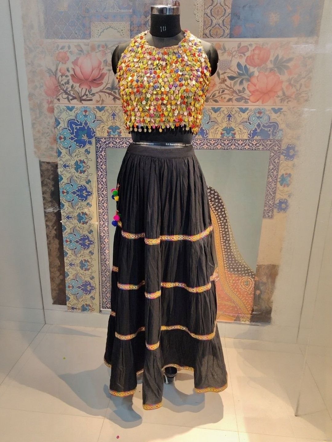 Black and yellow embroidered lehenga choli, mirror work